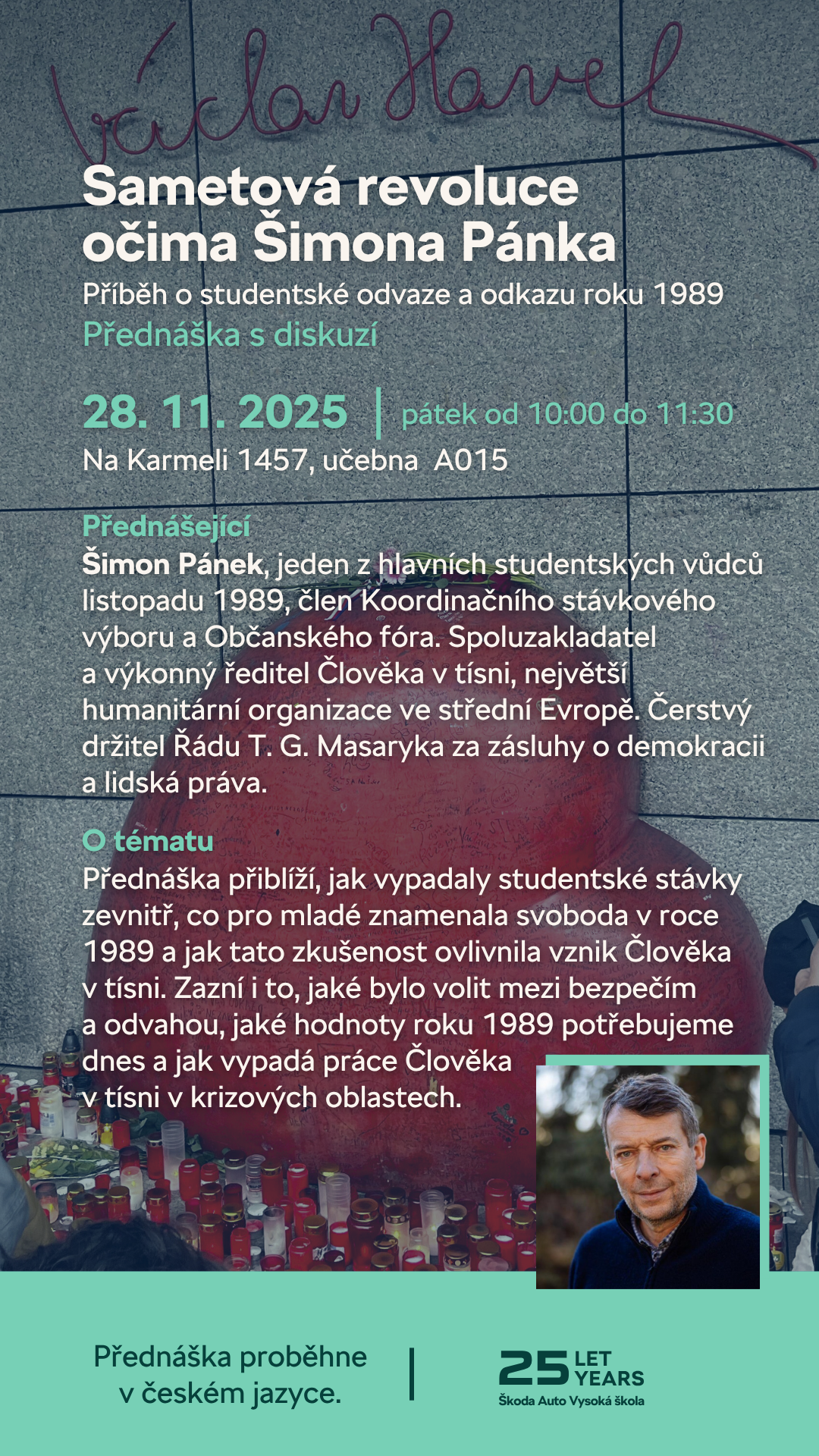 Přednáška s diskuzí se Šimonem Pánkem, spoluzakladatelem Člověka v tísni a jedním z hlavních představitelů listopadu 89: