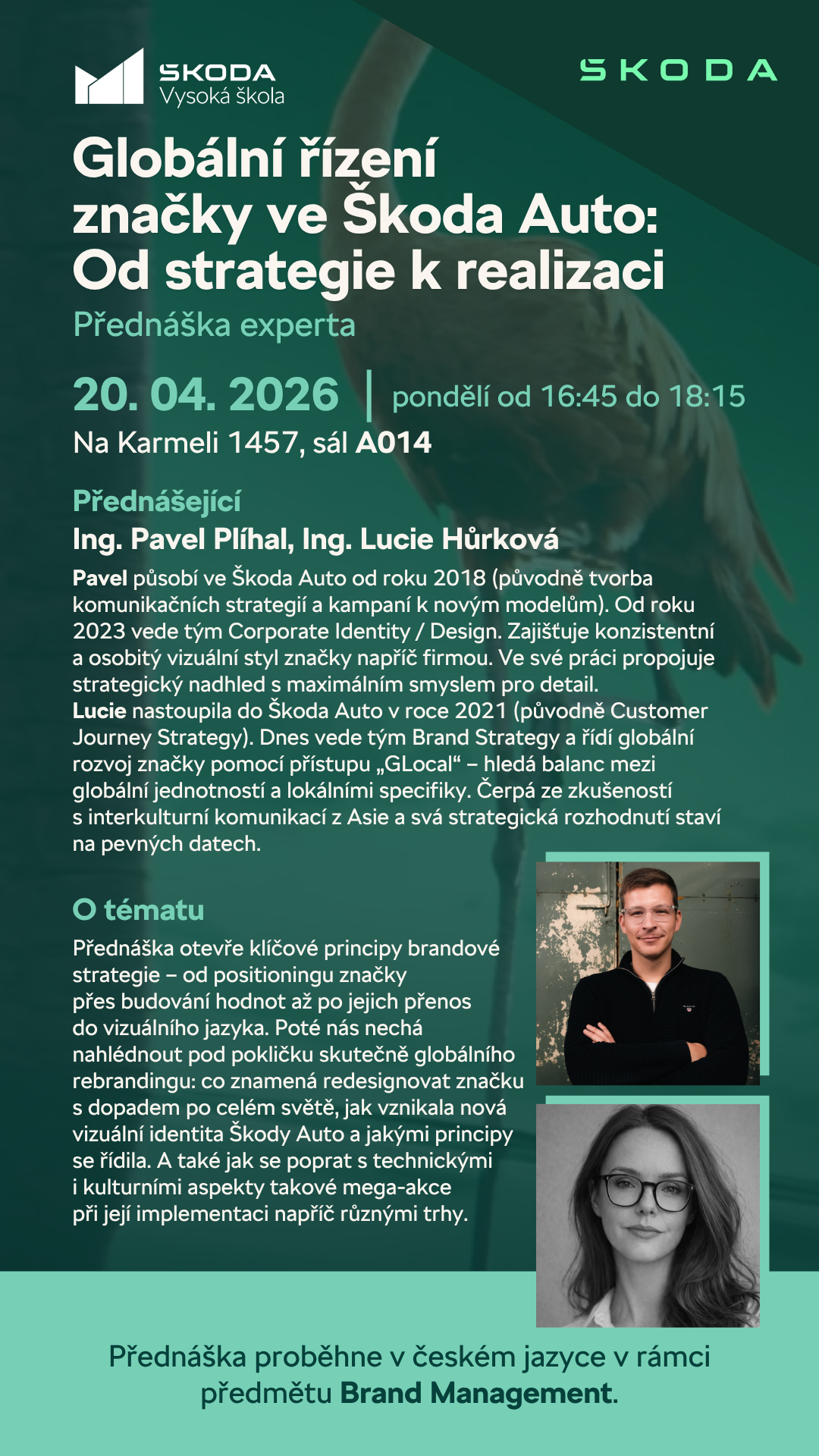 Přednáška s Pavlem Plíhalem a Lucií Hůrkovou na téma Globální řízení značky ve Škoda Auto - Od strategie k realizaci: